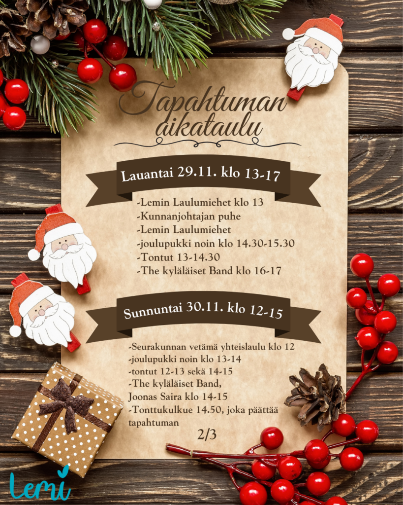 – Tämä on uudenlainen joulutapahtuma Lemillä. Siinä on mukana koko yhteisö yksityishenkilöistä yrittäjiin, kunnasta yhdistyksiin ja järjestöihin. Suuresti toivomme, että onnistuisimme saamaan ihmisille hyvän mielen ja pientä joulun taikaa taskuihinsa, hanketyöntekijä Soile Takkinen Päin perhettä -hankkeesta kertoo.