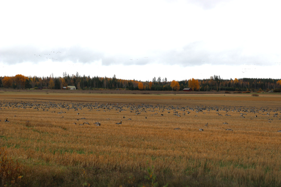 Taivas oli aika harmaa, pikkusen vettäkin vihmoi, mutta Elimäen pelloille piti pysähtyä ihmettelemään harmaata mattoa, joka kupruili mukavasti valkoposkihanhien ruokaillessa ruskealla sängellä. Taivaalla näkyi valtavia parvia matkalla jonnekin. Käännyttiin Kausalaan päin, miten upeaa ruskaa peltojen laitamilla, pihoissa ja tienposkessa… Taivaskin muuttui siniseksi, ja se sateenkaari sykki eukkosen sydämessä koko ajan!