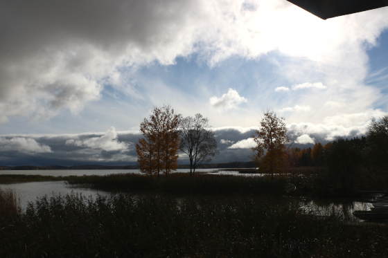 Järven yllä kaarteli kolme kotkaa, merikotkiksi arvelimme, mutta niin kaukana, ettei iästä voinut mitään sanoa. Aurinko kurkisteli harmaan pilvimassan yltä, sai tuulessa heiluvat heinät kimaltamaan ja rantapuitten lehdet levottomina lepattamaan. Yht’äkkiä taivaalta alkoi sataa lunta järveen! – Ei nyt sentään, mutta tummaa taustaa vasten veteen laskeutuvat hanhiparvet välkkyivät auringossa kuin valtavat lumihiutaleet, näky oli niin satumainen, ettei eukko ymmärtänyt nostaa kameraa tapahtumaa ikuistaakseen, ihmetteli vaan!
