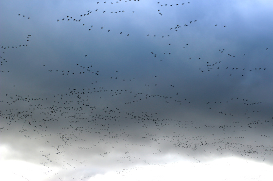 Järvi näytti tyhjältä, mutta kiikaroimalla näki puolen järven mittaisen parven lepäilevän lähellä vastarantaa. Nautimme köyhät eväämme tornin alatasanteella, ruovikossa pörähteli pieniä lintuja, kaukana langoilla arvelimme kottaraisiksi tai rastaiksi pikkuisia pisteitä, naakkoja taisi olla tuhansin haukkuvassa parvessa, ja niitä hanhia, jatkuvana virtana harmaan pilven sylissä!