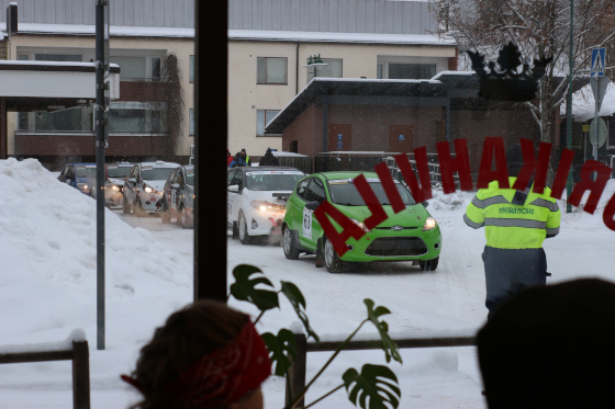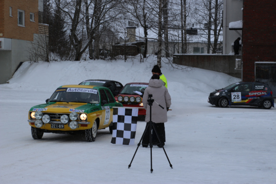 Miu taksiin ol vähä myöhäs, mut nii ol ralli lähtökkii. Eipä arvant mei kunnajohtaja Johanna Mäkelä, et ruutulipuvartee joutus, ja sais kaikil 150 autol lähtöhuiskautukse antaa!. Täs hää laittaap matkaa Opeleit ja Fordeja, siin on hyvi värikkäit, 22 keltavihree, ja tuol taaempan oottaap tummemp 28, jost ehi ottaa nimet, siin ajjaat Teinilät.
