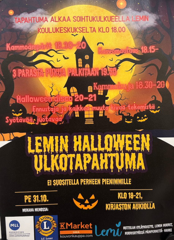 Lemin nuoret, nuorisotyön Päin perhettä -hanke ja Huttulan martat kutsuvat väkeä perjantai-iltana kirjaston aukiolle halloween-ulkotapahtumaan.