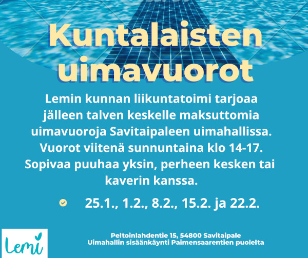 Lemin kunta tarjoaa kuntalaiisilleen viisi uimavuoroa Savitaipaleen Suvannossa, viitenä sunnuntaina. Ensimmäinen vuoro on ensi sunnuntaina 25. tammikuuta.