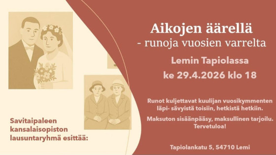 Runojen ääreen Tapiolaan25.4.202625.4.2026 Kansalaisopiston lausuntaryhmä esittää talven aikana oppimaansa Lemin Tapiolassa ensi keskiviikkona 29. huhtikuuta. Kello 18 alkavaan Aikojen äärellä -esitykseen on vapaa pääsy, tarjoilu on maksullista. Avainsanat:lausuntaryhmäSavitaipaleen kansalaisopistoTapiola VastaaSähköpostiosoitettasi ei julkaista. Pakolliset kentät on merkitty *Nimi * Sähköpostiosoite * Verkkosivusto Kommentti * Tallenna nimeni, sähköpostiosoitteeni ja sivustoni tähän selaimeen seuraavaa kommentointikertaa varten.