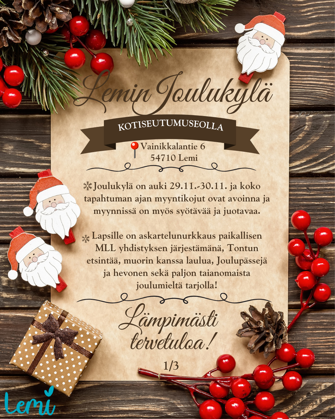 24.11.2025Lemin joulu avataan kaksipäiväisellä Joulukylä-tapahtumalla Kotiseutumuseolla tulevana viikonnloppuna 29.–30 marraskuuta. Tekemistä ja näkemistä on luvassa kaikenikäisille.
