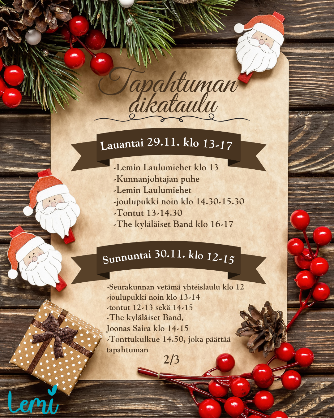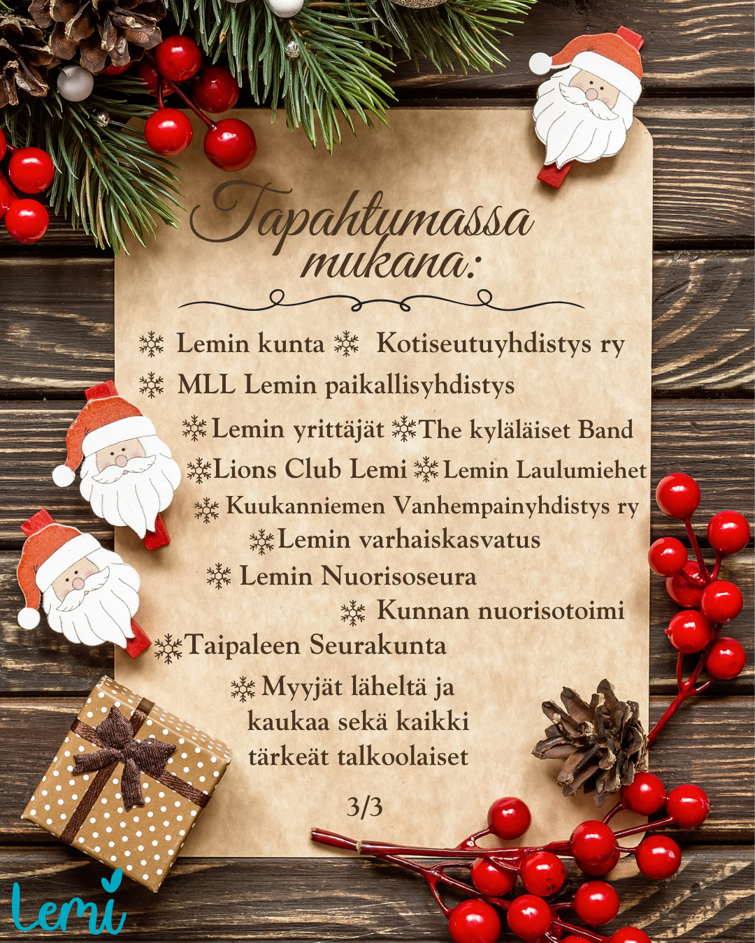 – Tämä on uudenlainen joulutapahtuma Lemillä. Siinä on mukana koko yhteisö yksityishenkilöistä yrittäjiin, kunnasta yhdistyksiin ja järjestöihin. Suuresti toivomme, että onnistuisimme saamaan ihmisille hyvän mielen ja pientä joulun taikaa taskuihinsa, hanketyöntekijä Soile Takkinen Päin perhettä -hankkeesta kertoo.